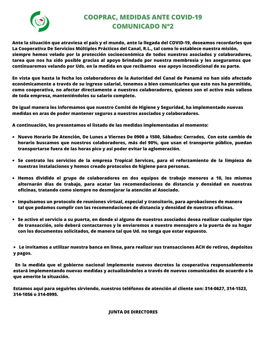 25/03/2020 COMUNICADO: Medidas ante COVID-19 By Cooprac R.L. Al día con Cooprac Hacemos de conocimiento a todos nuestros asociados el siguiente comunicado de la Junta Directiva de COOPRAC R.L.