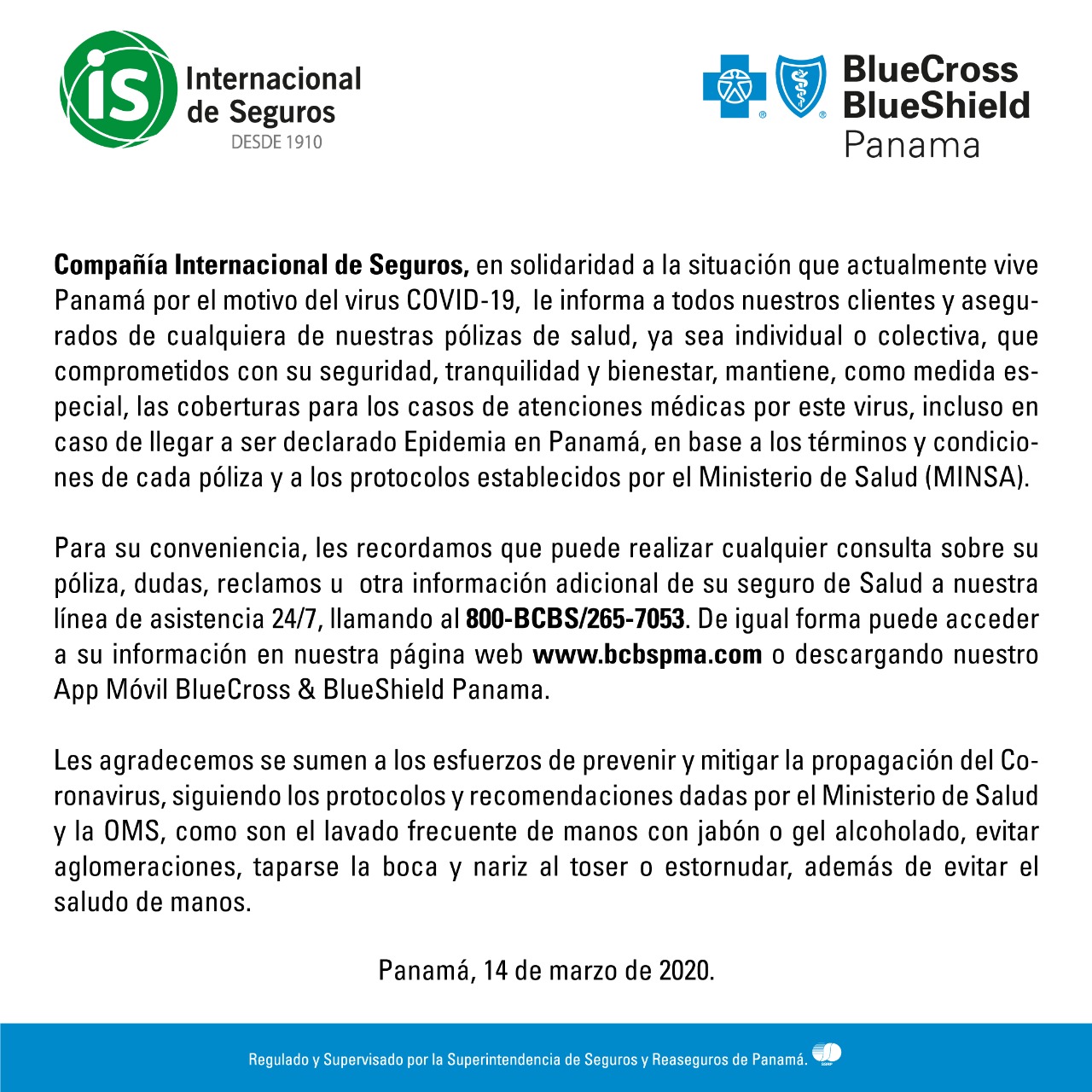 Compañía Internacional de Seguros, en solidaridad a la situación que actualmente vive en Panamá por motivo del coronavirus, le informa a todos nuestros clientes y asegurados en cualquiera de nuestras pólizas de salud, ya sea individual o colectiva, que comprometidos con su seguridad, tranquilidad y bienestar, mantiene, como medida especial, la cobertura para los casos de atención médica por este virus, incluso en caso de llegar a ser declarado epidemia en Panamá, en base los términos y condiciones de cada póliza y en los protocolos establecidos por el Ministerio de Salud.