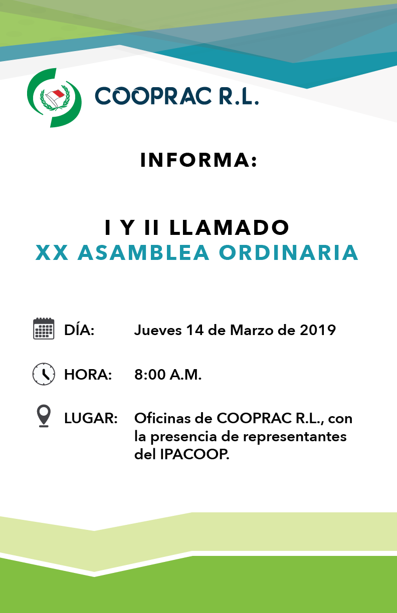 El jueves 14 de Marzo de 2019 desde las 8:00 a.m. en las oficinas de la Cooperativa, estaremos realizando nuestra XX Asamblea Ordinaria, en la que se realizará el I y II llamado. Contaremos con la presencia de representantes del IPACOOP, por lo que le solicitamos su asistencia. Desde las 11:00 a.m. todos nuestros asociados podrán disfrutar de una rica Barbacoa.